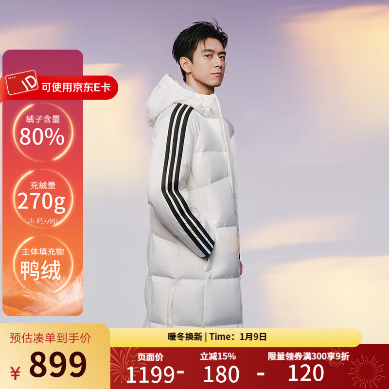 阿迪达斯(adidas) 长款羽绒服男款女款 25冬季防寒保暖运动休闲连帽过膝鸭绒服外套 KC2497 白色/男女同款 M