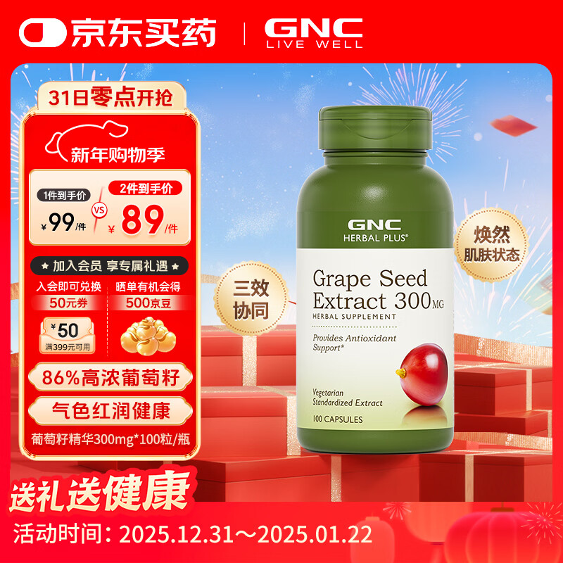 GNC健安喜 葡萄籽精华胶囊300mg 女性全身美白淡斑抗氧化含原花青素 300mg 100粒*1瓶