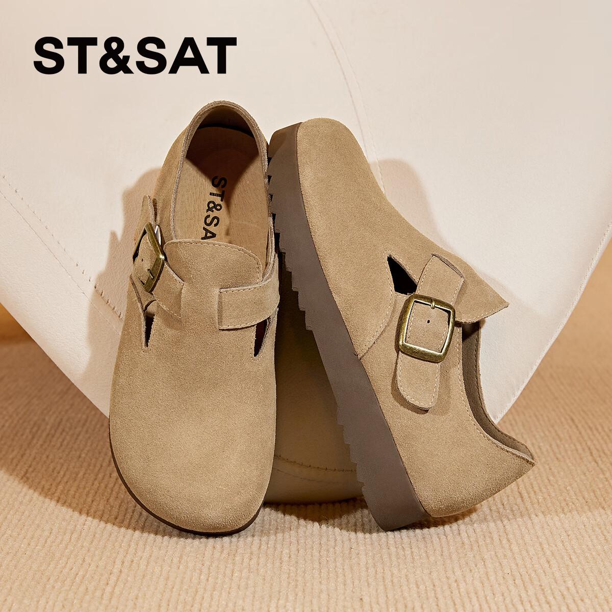 星期六真皮全包勃肯鞋女款2025新款秋冬季浅口单鞋复古百搭软底休闲女鞋 杏色 【复古百搭】跟高2.5cm 35