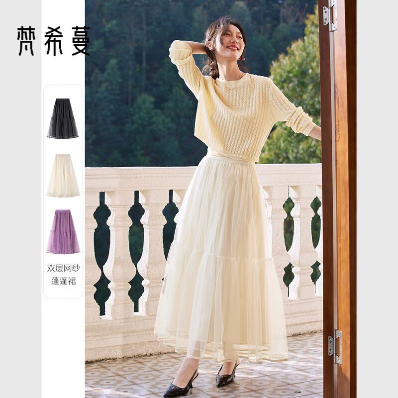 白鹿语高腰甜美A字网纱裙秋季新款轻盈感长裙半身裙 杏色 M