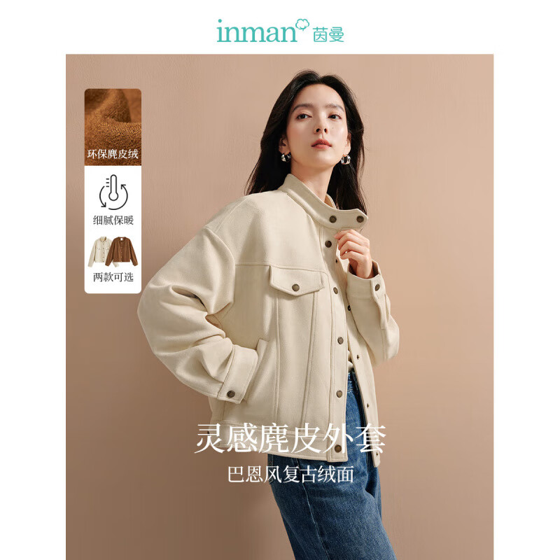 茵曼(INMAN)复古麂皮绒休闲外套2026春季新款女装高级宽松长袖小个子夹克上衣 浅杏色 M