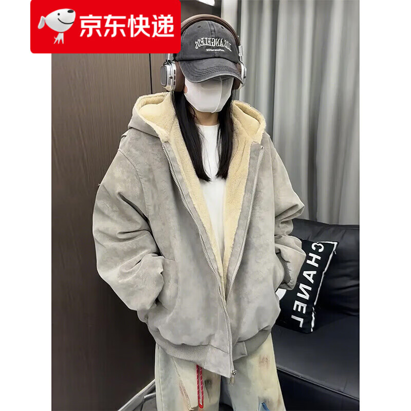 夹棉羊羔绒外套女秋冬宽松立领毛绒卫衣学生百搭加厚保暖上衣J068 杏色 M (110-130斤)