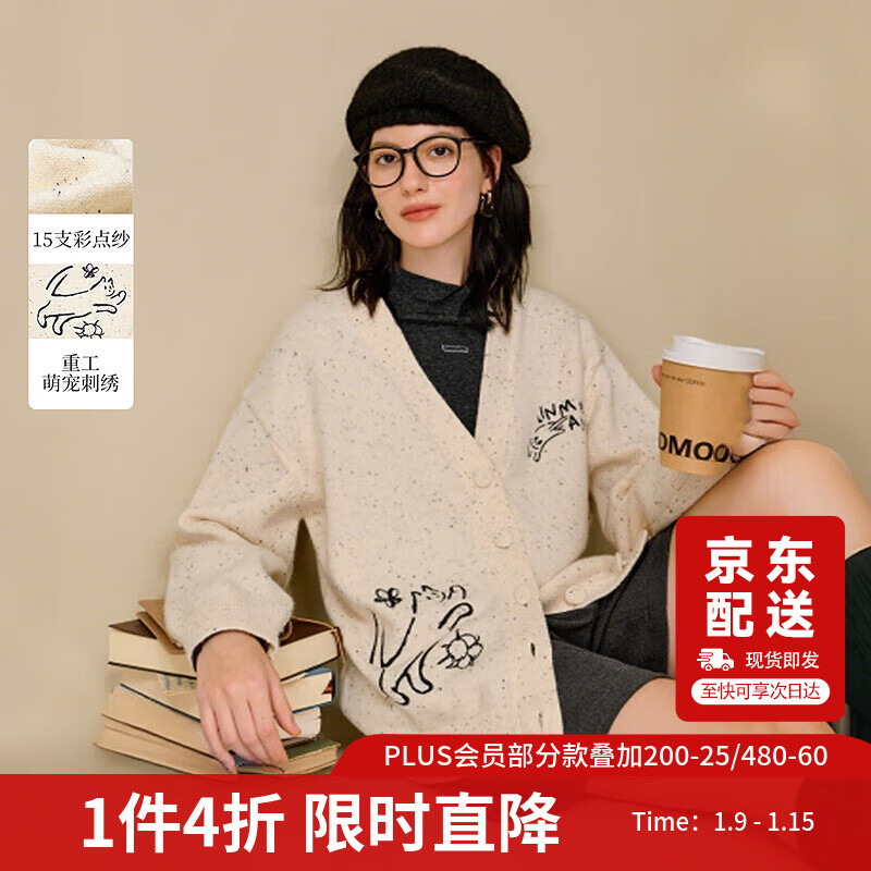 茵曼(INMAN)茵曼彩点纱萌宠刺绣针织开衫2025冬女装新款显瘦毛衣外套 杏色 M