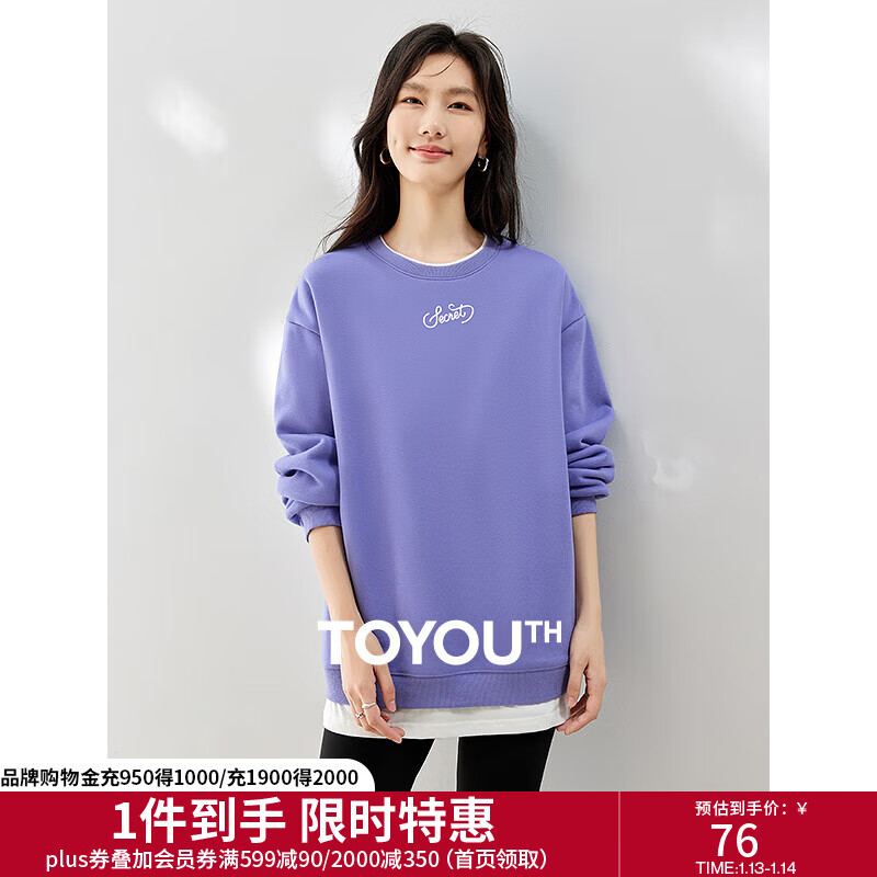 初语假两件加绒卫衣女2024秋冬新款宽松显瘦休闲圆领上衣 浅紫色-secret M
