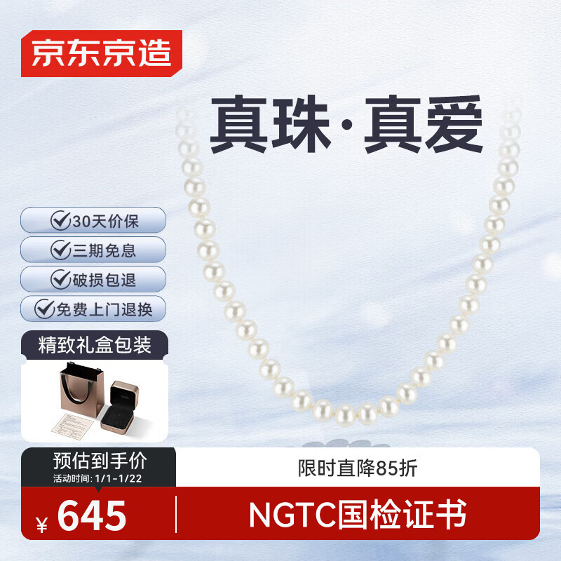 京东京造珠韵经典淡水珍珠项链7-8mm近圆