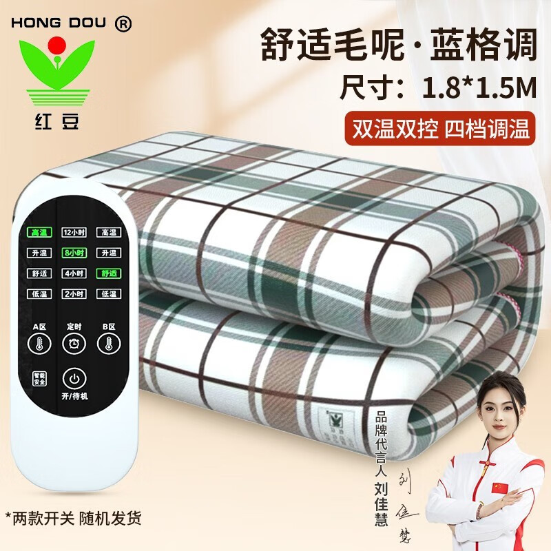 红豆HongDou电热毯智能除螨定时双温双控电热毯 4D工艺-双温双控长1.8宽1.5米