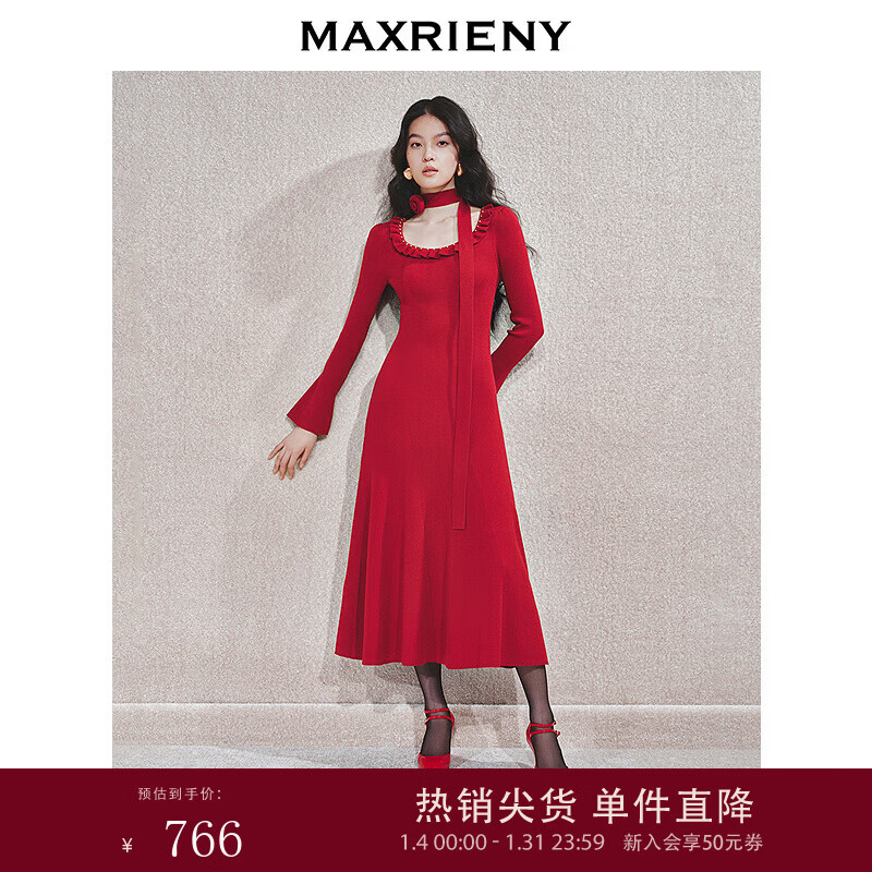 MAXRIENY骐骥红千金miu系穿搭撞色针织连衣裙25冬款小香风收腰X型长裙 红色 S