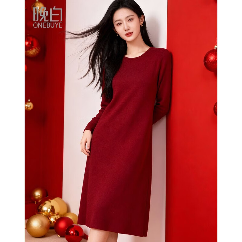 晚白【新品】2026春款骐骥红气质时尚新年穿搭长袖连衣裙 酒红色 M (108斤-110斤)