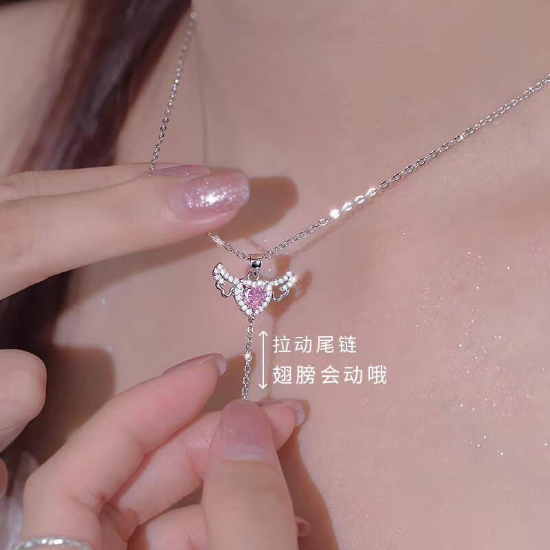 诗筠(SHIJUN)情人节周年礼物送老婆s925银丘比特之心项链女天使会动的翅膀锁骨 银丘比特之心项链粉石