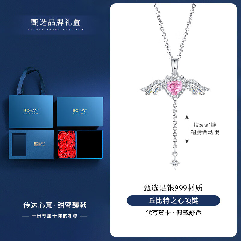bhiodha丘比特之心S银项链女轻奢小众天使锁骨链会动翅膀情人节女 999足银丘比特之心+挚爱礼盒