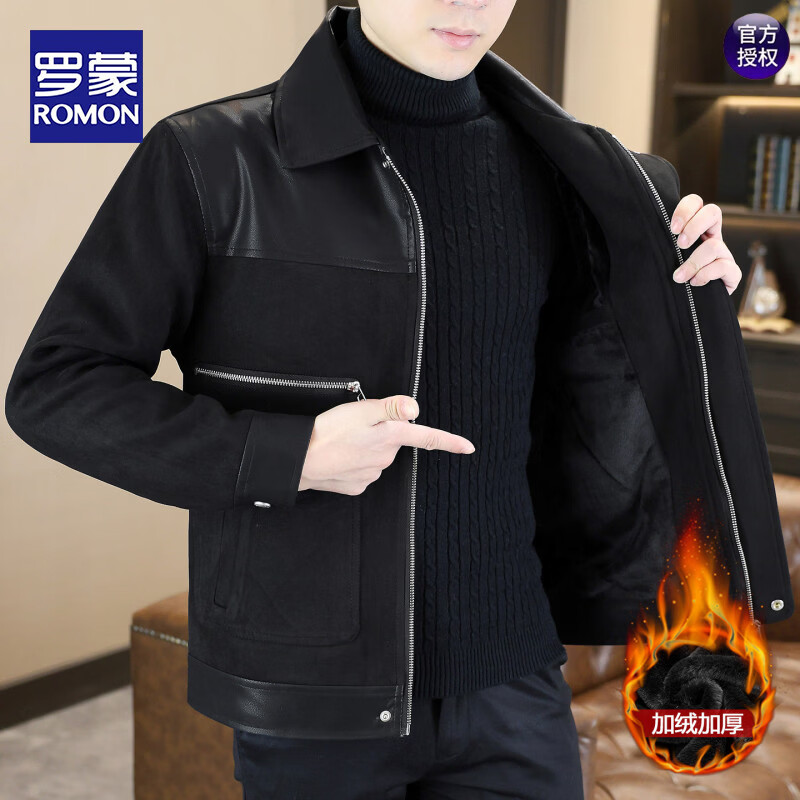 罗蒙(ROMON)冬季新款加绒加厚翻领仿皮夹克男士韩版休闲高级感拼接皮衣外套男 黑色 M 建议90-110斤