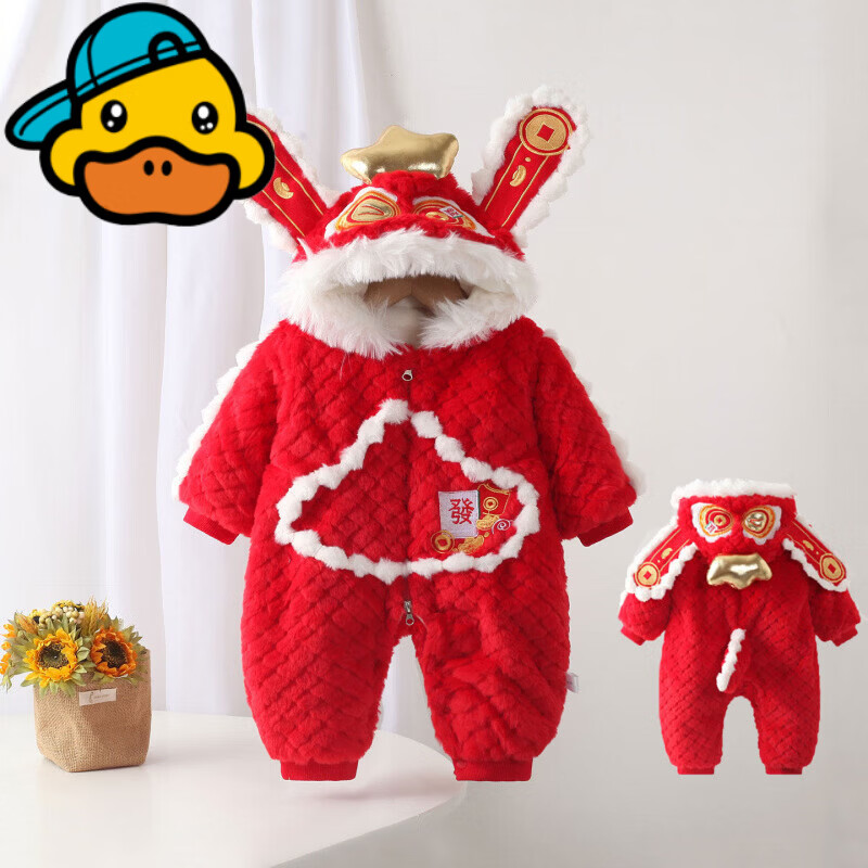 婧麒(JOYNCLEON)新生婴儿连体衣宝宝冬装加绒保暖连帽爬服新年拜冬年服爬爬服 喜庆小宝 73cm 【6-9个月建议体重7.2-9kg】