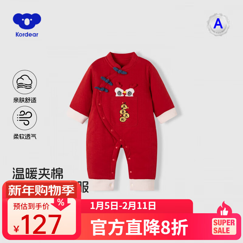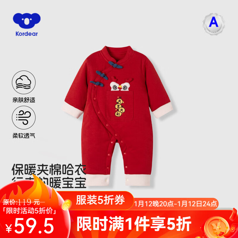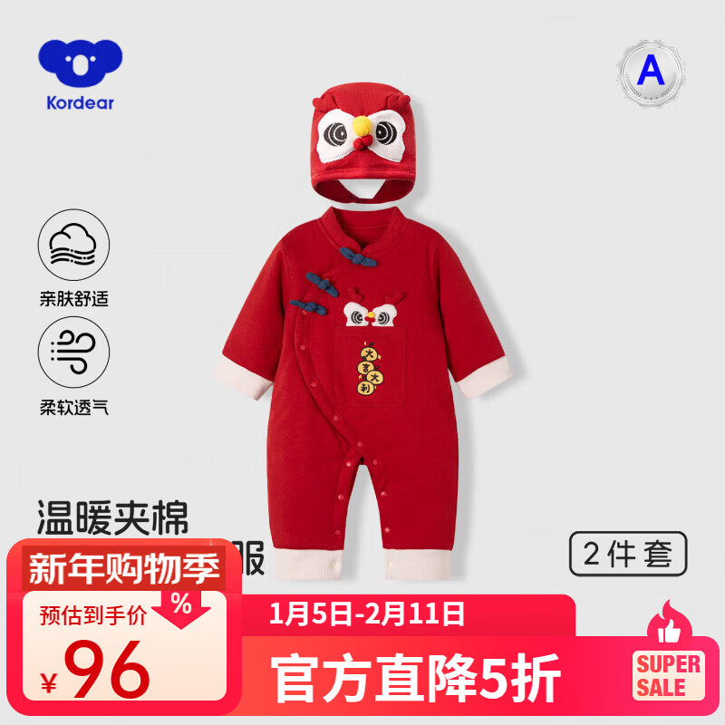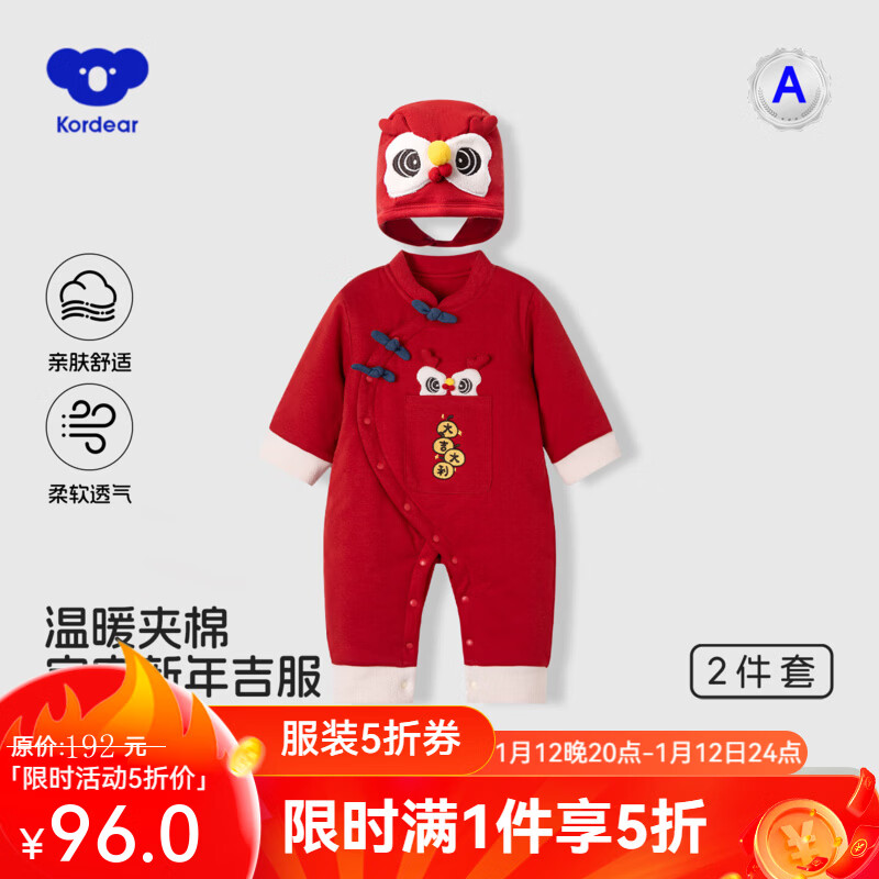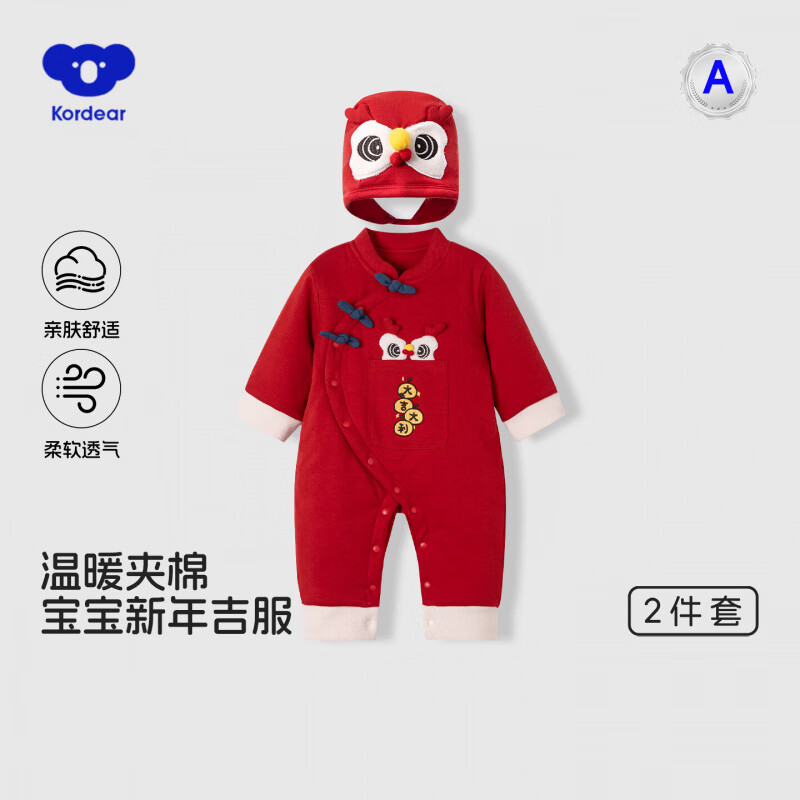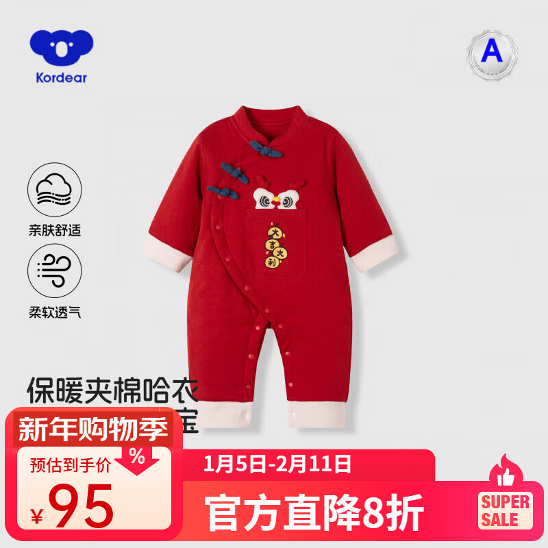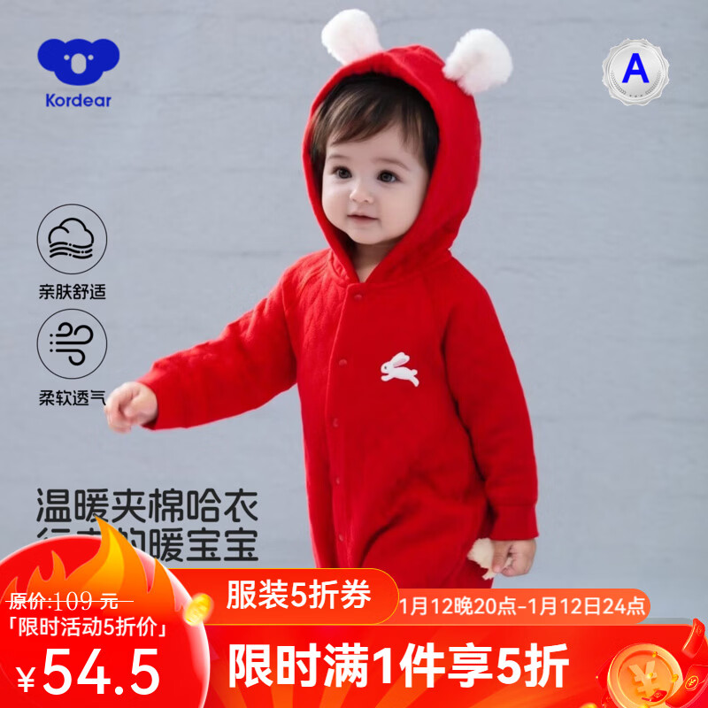Kordear婴儿冬装夹棉连体衣红色连帽哈衣宝宝新年衣服拜冬年服 红色 90cm