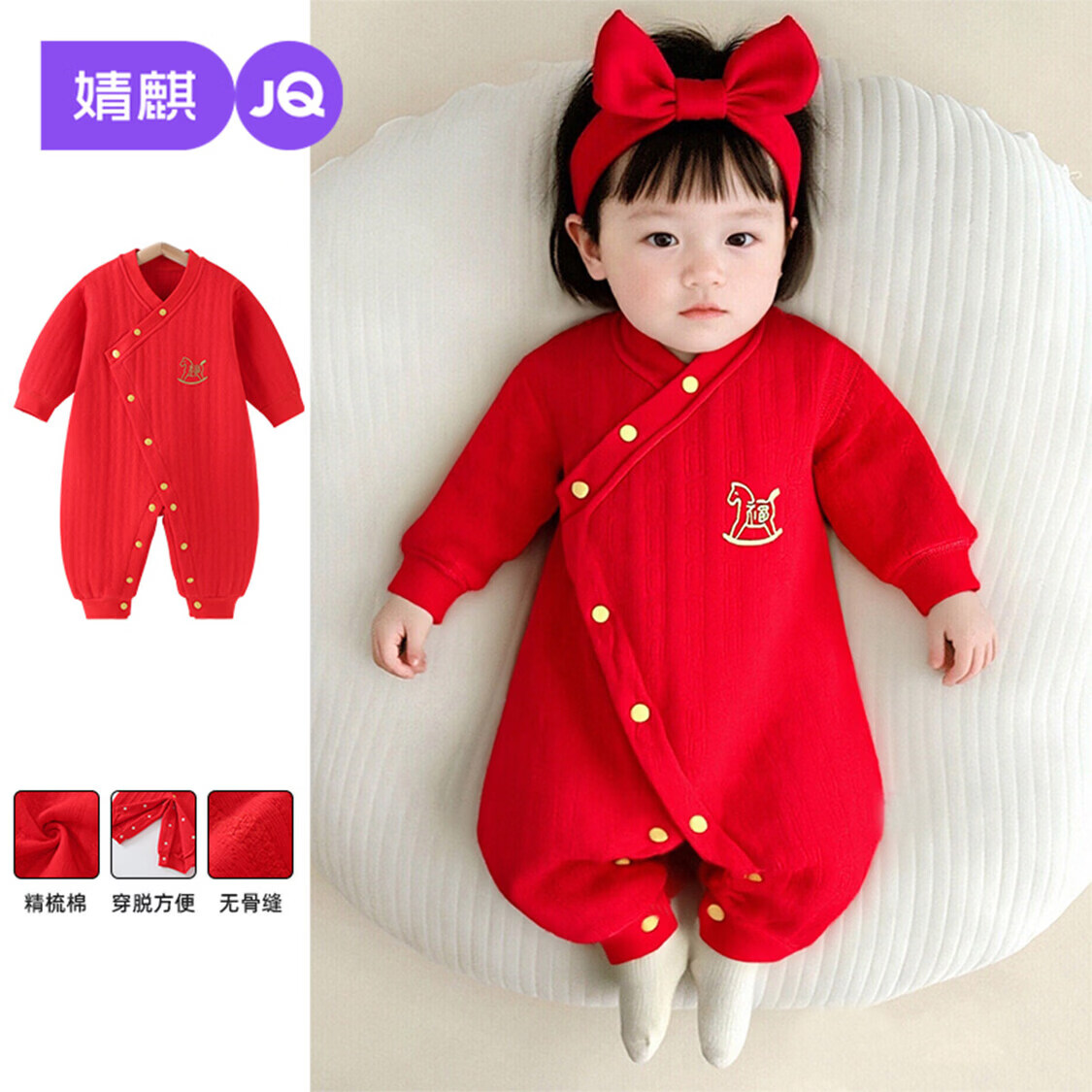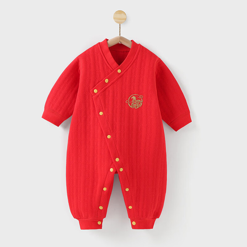 婧麒(JOYNCLEON)婴儿宝宝拜冬年服宝宝连体衣哈衣夹棉保暖新年外出爬爬服冬装 红 90cm 【1-2岁建议体重9.5-13kg】