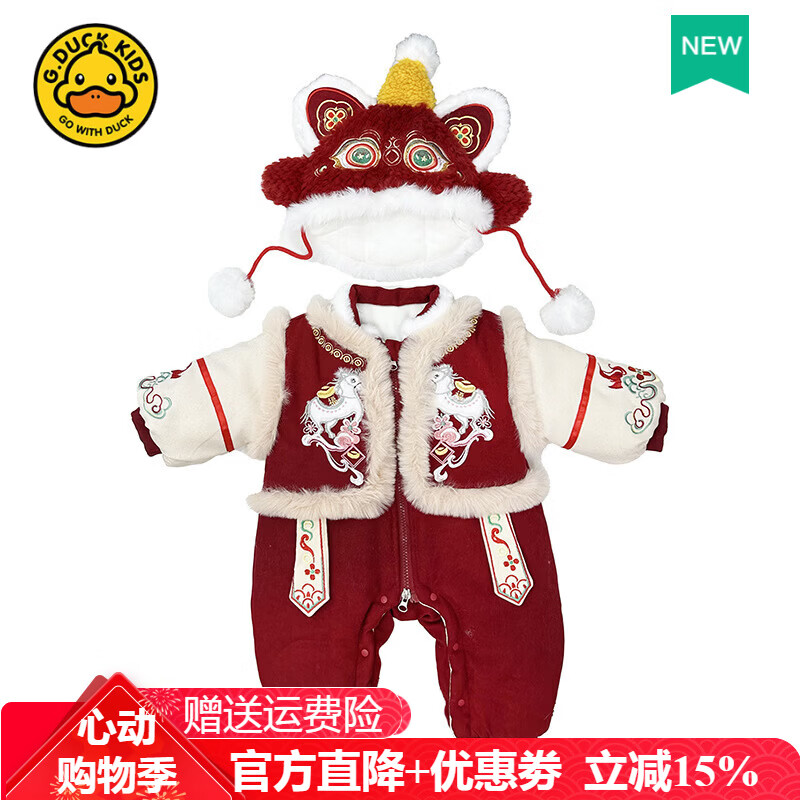 G.duck宝宝周岁衣服喜庆冬装礼服婴儿拜冬年服冬季新中式连体衣过年棉服 可爱小马厚棉哈衣+帽子 66cm