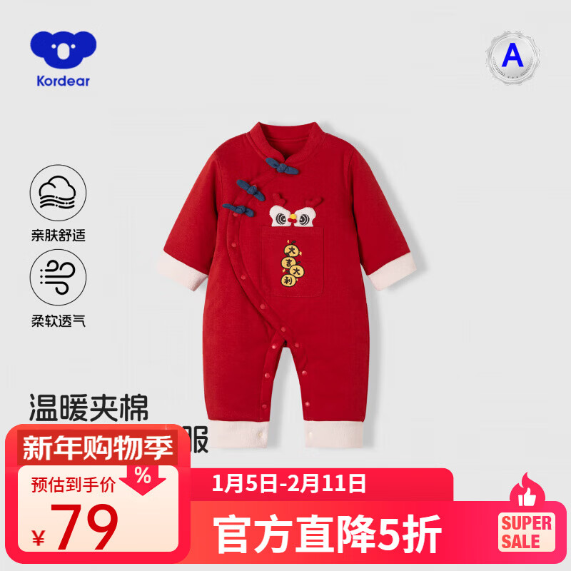 Kordear宝宝加厚夹棉保暖连体衣婴儿拜冬年服红色过新年服棉服 大吉大利 73cm