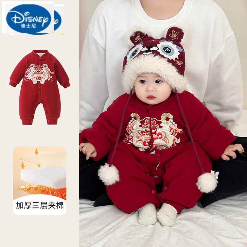 迪士尼(Disney)婴儿拜冬年服宝宝连体冬季新中式婴幼儿夹棉加厚过年周岁外出衣服 国风喜狮爬服【加厚三层夹棉200g】 73cm (建议15-18斤)