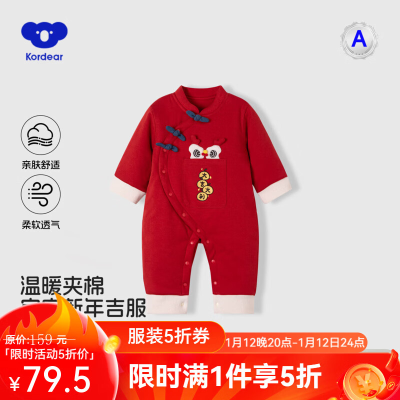 Kordear宝宝加厚夹棉保暖连体衣婴儿拜冬年服红色过新年服棉服 大吉大利 80cm