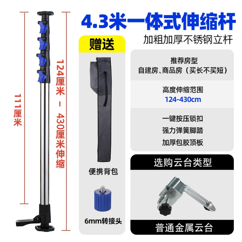 山头林村红外线撑杆伸缩杆加厚水平仪升降支脚踏式底座一键按压自由伸缩不 4.3米不锈钢款+铁云台+脚踏底座+一秒按压