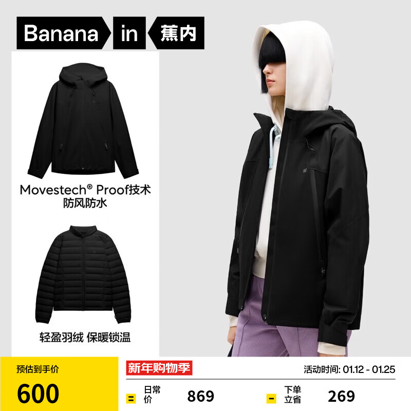 蕉内(Bananain)氧气502Proof Pro女士羽绒内胆三合一冲锋衣秋冬女装短外套 黑色 M