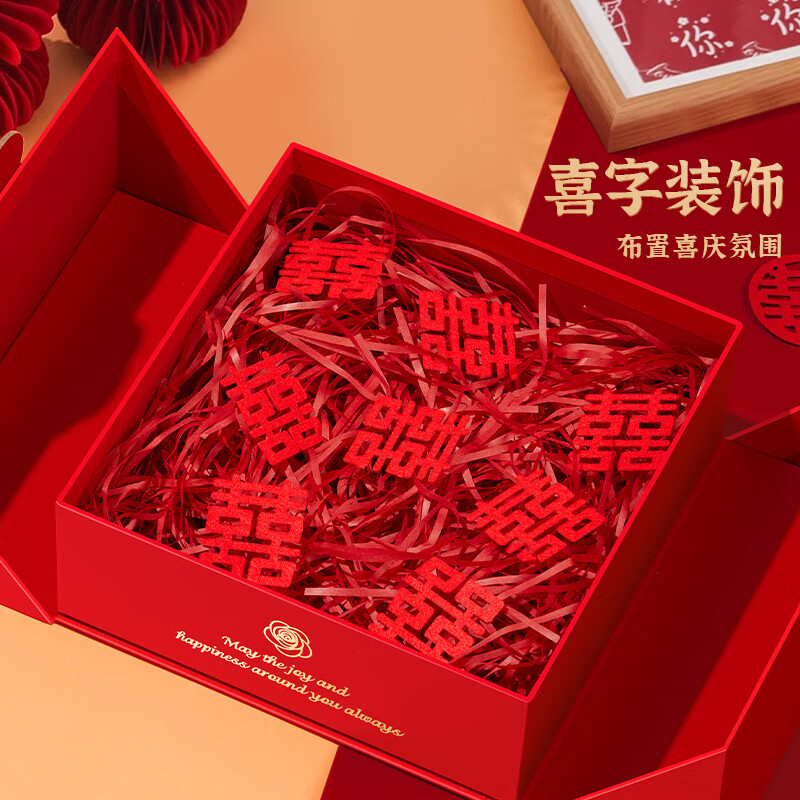 绘萌伴手礼盒红色结婚包装盒生日礼物盒子空盒回礼高级感送伴娘礼品盒 【囍礼盒+灯+花束】袋+草+贺卡 4号24*17*8cm
