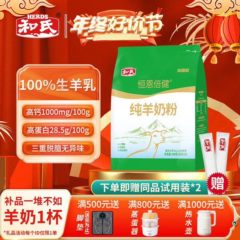 和氏(HERDS)纯羊奶粉400g袋装全脂生羊乳奶粉成人中老年原生高钙独立小条装 3袋+4条试用装