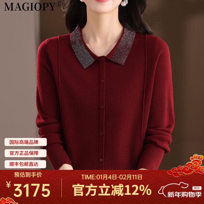MAGIOPY国际高端洋气中年女士纯羊毛衣女开衫秋冬翻领大码妈妈纯色针织 酒红色 S 【建议80-100斤】