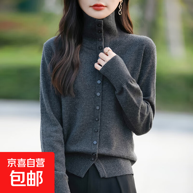 罗蒙(ROMON)纯羊毛衫时尚百搭加厚高翻领针织开衫外套女新款外穿大码秋冬毛衣 100%好品质-深灰色-女装十大品牌 M (90-105斤)