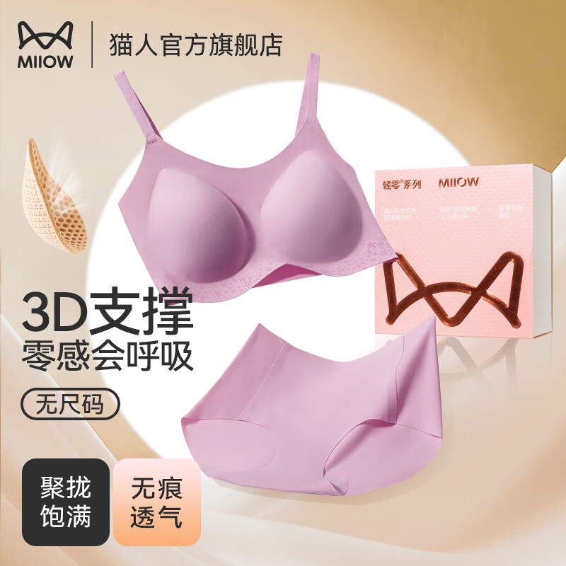 猫人(MiiOW)背心式文胸女士内衣女无痕无钢圈收副乳聚拢胸罩无尺码文胸 宽肩带-香芋紫(文胸+内裤) 均码 -纤细版(建议80-120斤)