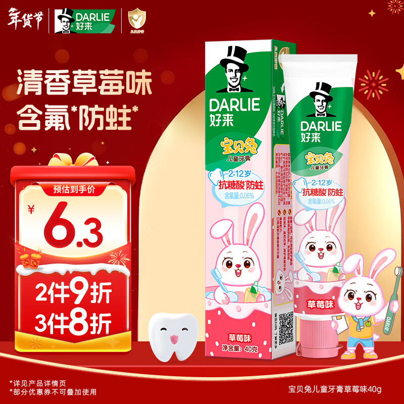 DARLIE好来(原黑人)宝贝兔儿童牙膏2-3-6-12岁 草莓味40g 含氟防蛀抗糖