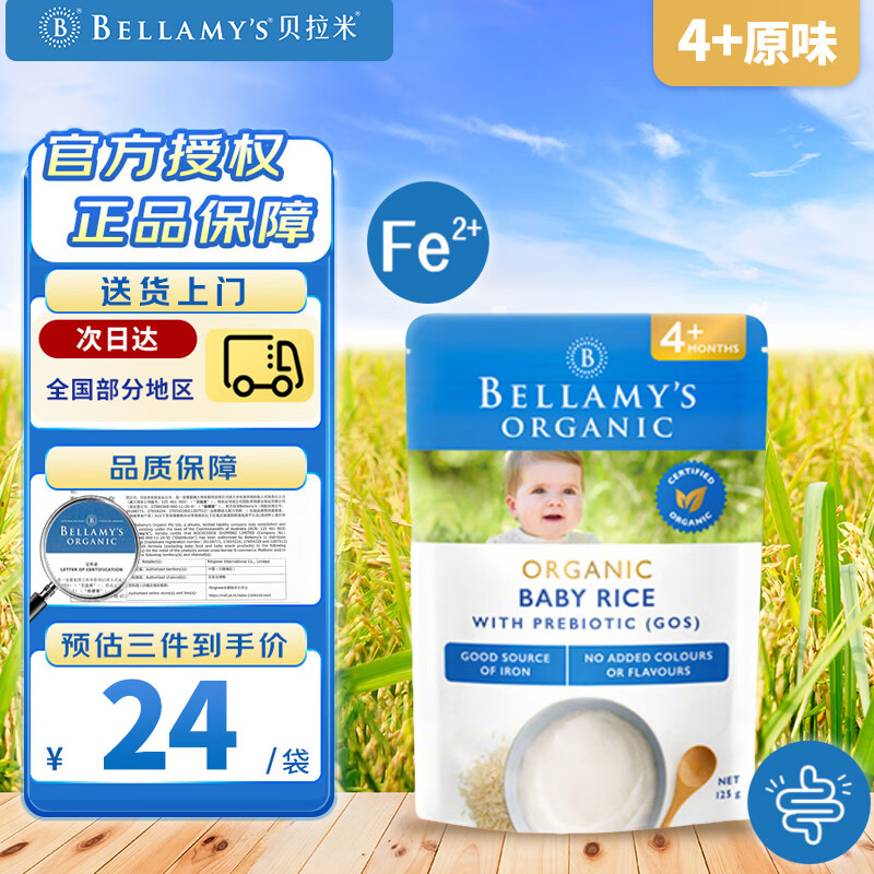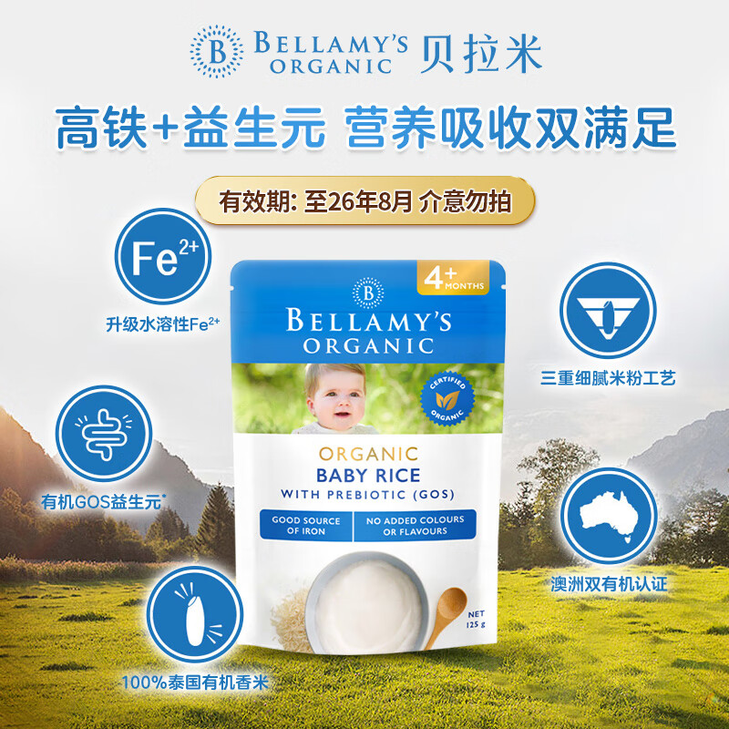 贝拉米(Bellamy's)澳洲进口有机高铁米粉宝宝辅食营养米糊含益生元 有机纯米糊4+保质期26年11月 125g*1袋