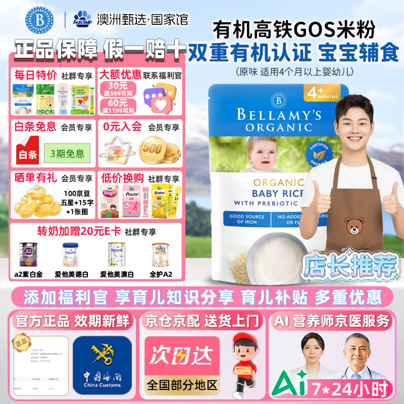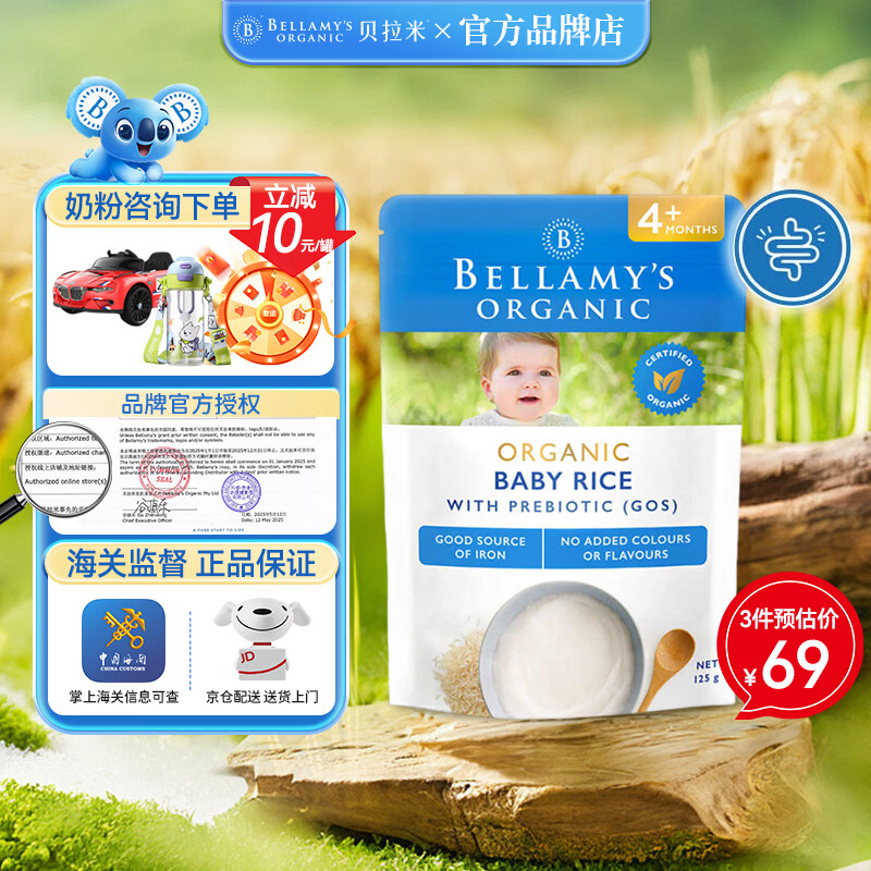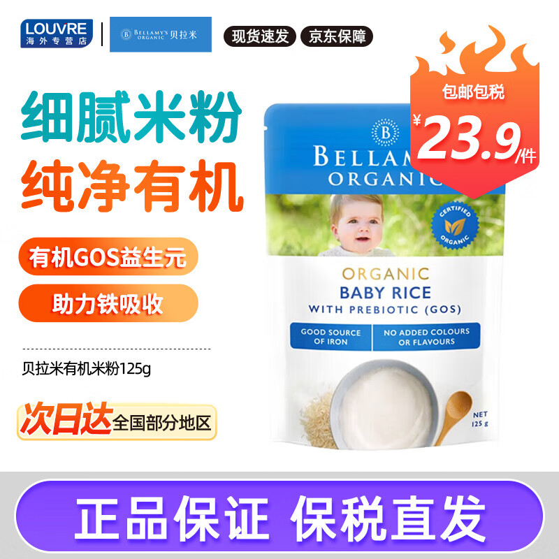 贝拉米(Bellamy's)婴幼儿有机 辅食 米粉125g/袋装 澳洲进口高铁益生元宝宝辅食米糊 原味 适用4+月龄 125g*1袋 效期26年7月 晒单领100京豆