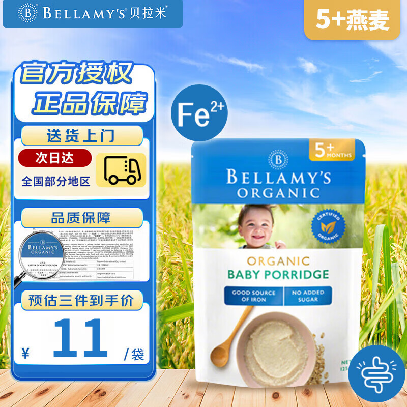 贝拉米(Bellamy's)澳洲进口有机高铁米粉宝宝辅食营养米糊含益生元 燕麦米粉5+保质期26年4月 125g*1袋