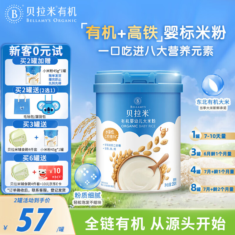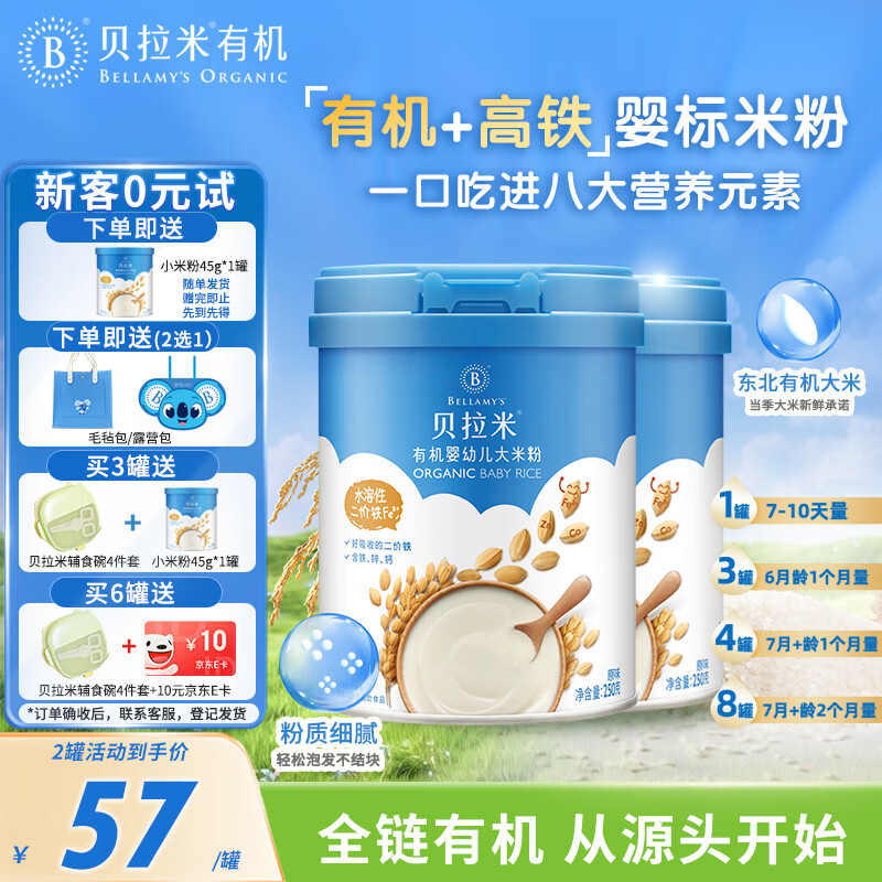 贝拉米(Bellamy's)婴幼儿高铁有机米粉 原味250g*2罐 水溶性二价铁6月+