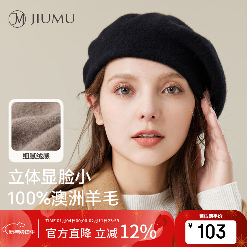 玖慕(JIUMU)纯羊毛贝雷帽秋冬季保暖毛呢画家帽日系英伦复古经典百搭帽子女