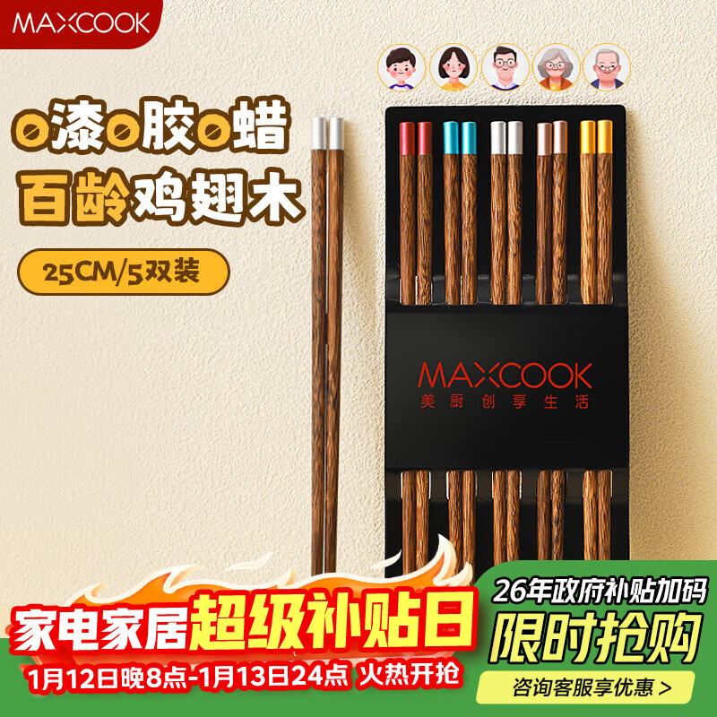 美厨(MAXCOOK)筷子木筷 分色筷天然家用鸡翅木筷子 筷子金福圆筷5双MCK8562