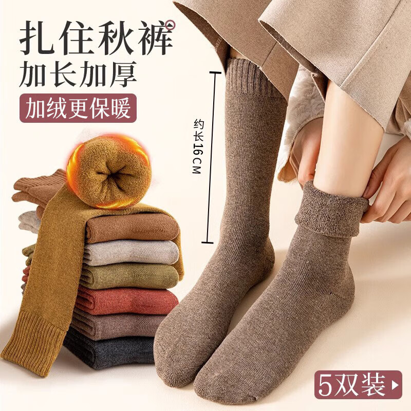俞兆林5双厚袜子女秋冬季加绒加厚中筒袜女士保暖毛圈袜美拉德冬天长袜