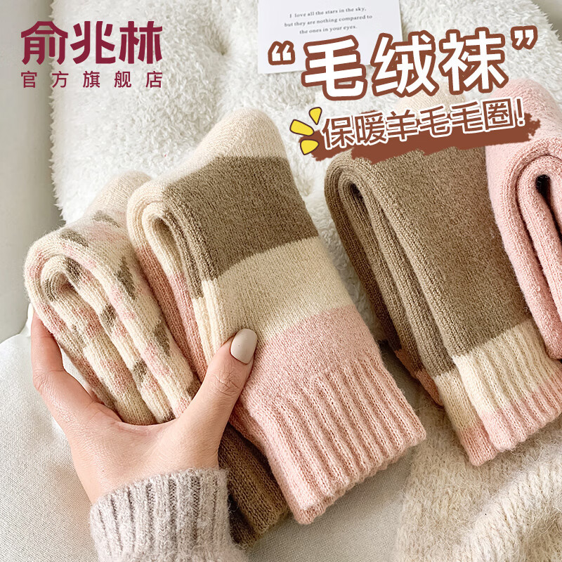 俞兆林4双羊毛袜子女士中筒袜秋冬季加绒加厚保暖7A抗菌毛圈地板雪地袜