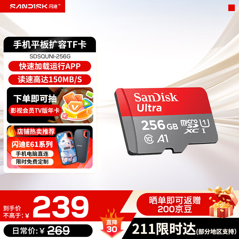 闪迪(SanDisk)TF卡 监控内存卡行车记录仪存储卡手机内存MicroSD卡 至尊高速 256G【送读卡器】 150MB/S