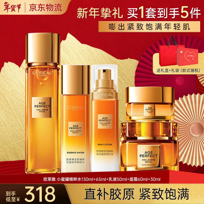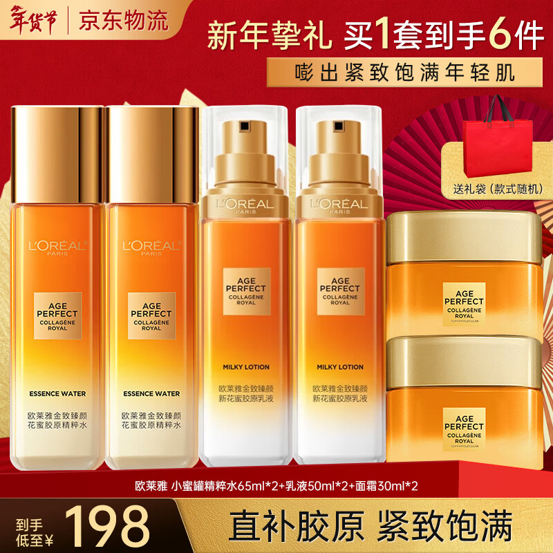 欧莱雅(LOREAL)护肤品套装小蜜罐花蜜胶原水乳套装紧致抗皱护肤礼盒新年礼物 随机品牌面膜*1
