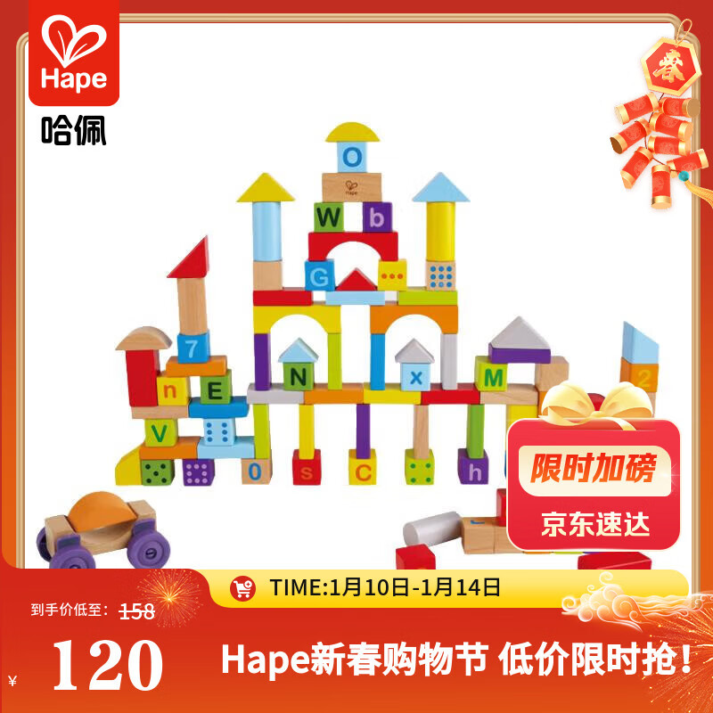 Hape(德国)儿童积木玩具木质100粒双面数字字母桶装宝宝新年礼物E8488