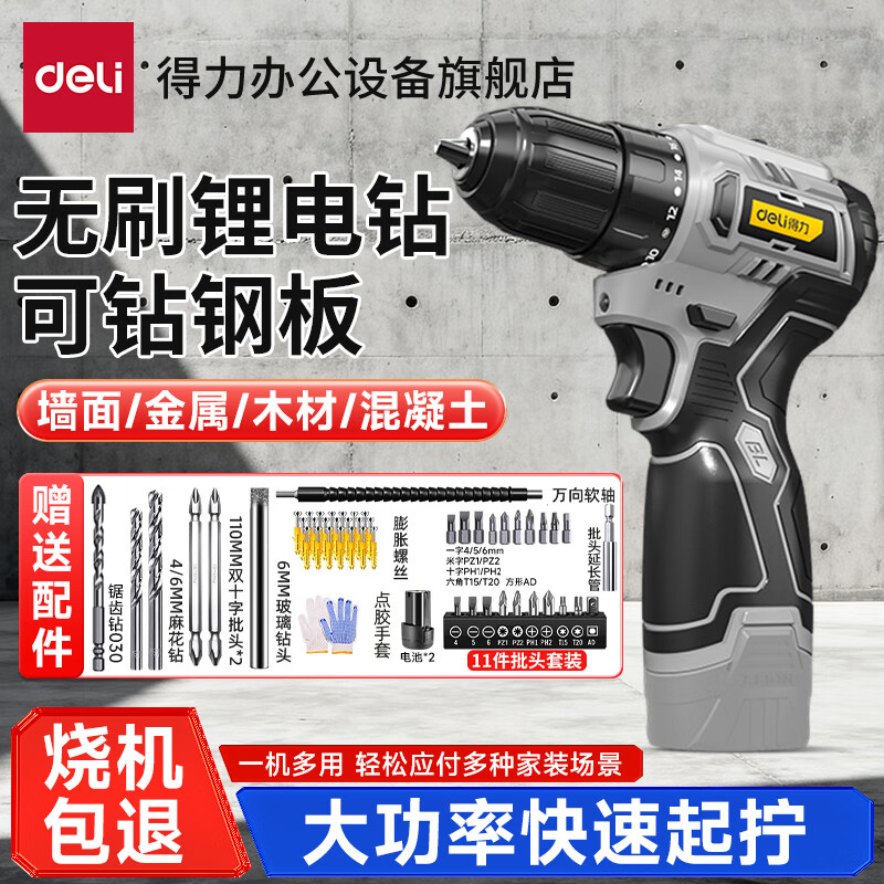 得力(deli)电钻家用小型无线手电钻锂电池电动工具起拧螺丝开孔打墙工业手钻 暮色灰【12V 30N.m扭矩】【两电一充】锯齿钻-常用附件