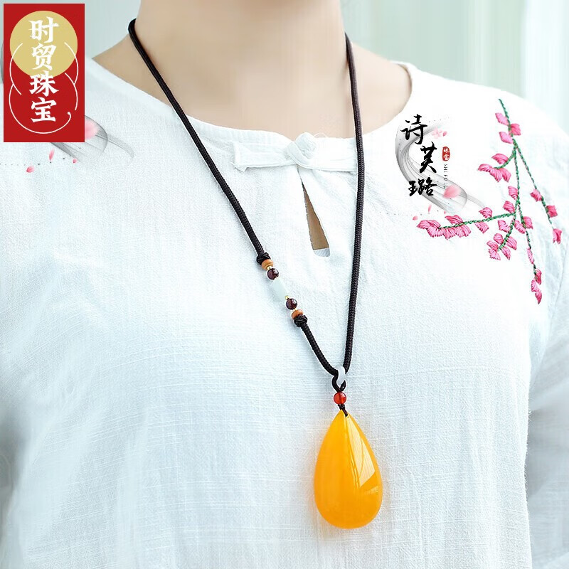 亲恒荟保价官方蜜蜡吊坠女水滴形鸡油黄平安无事牌毛衣链琥珀 水滴吊坠(珠链)