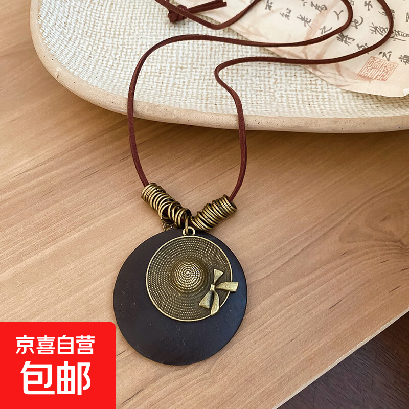 木头圆形帽子水滴形树叶吊坠项链复古民族风锁骨链小众设计感项饰 项链-咖色-圆形-帽子