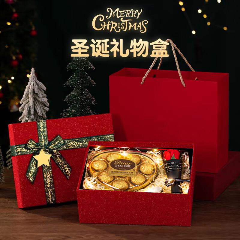 绘萌圣诞礼盒礼物盒空盒子仪式感平安夜包装盒高级感手拎高级感礼品盒 星星红盒+礼袋+拉菲草+贺卡 【加大号】41*29*14厘米