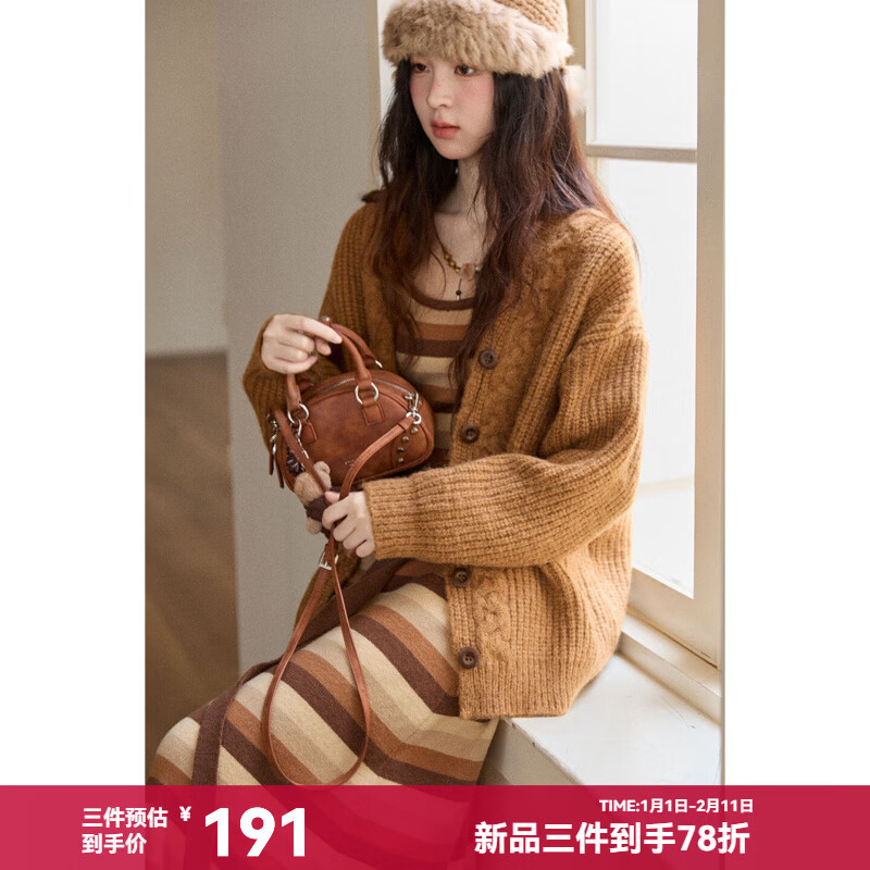 谜秀新年礼遇季橘咖色针织开衫+条纹连衣裙女2025秋冬季新款法式穿搭 橘咖色 针织衫 S
