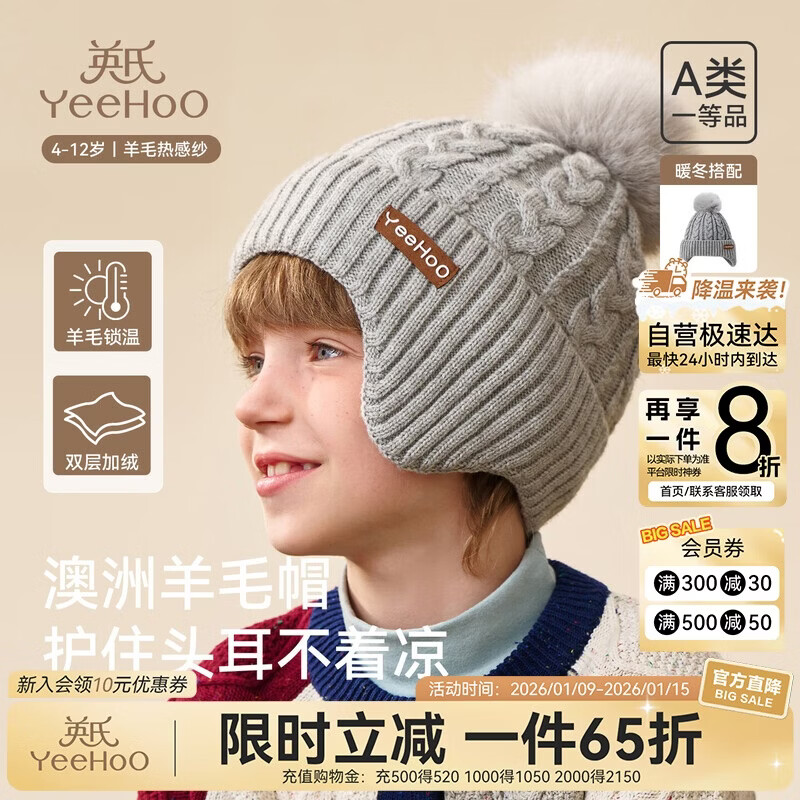 英氏(YEEHOO)羊毛保暖宝宝帽子护耳设计儿童针织帽双层加绒加厚中大童儿童帽子