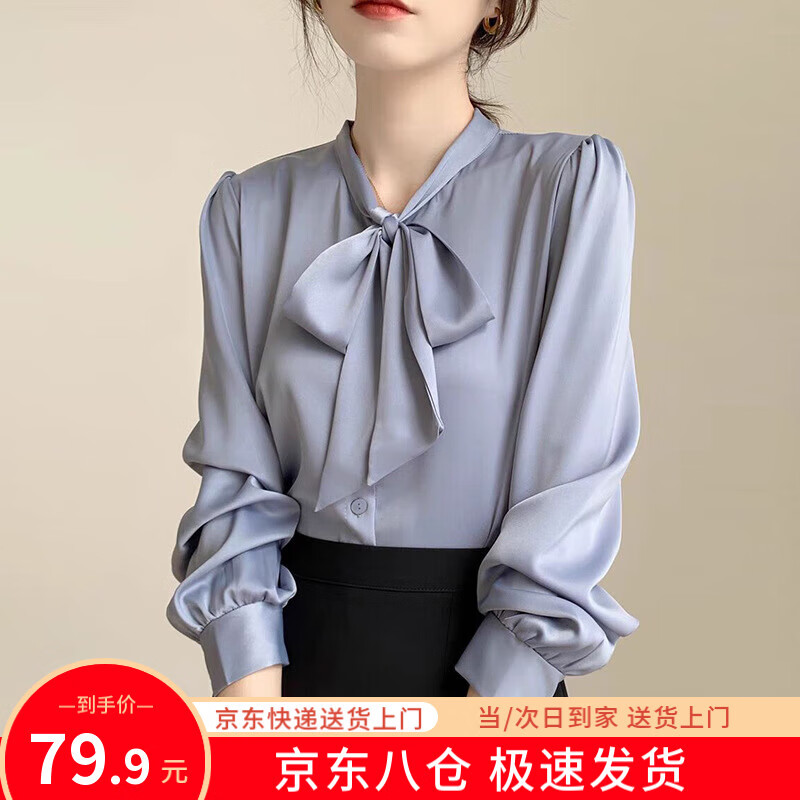 何佳功衬衫女2025春秋季新款时尚蝴蝶结气质高级感职业装长袖上衣衬衣 雾蓝色 L 【建议109-118斤】