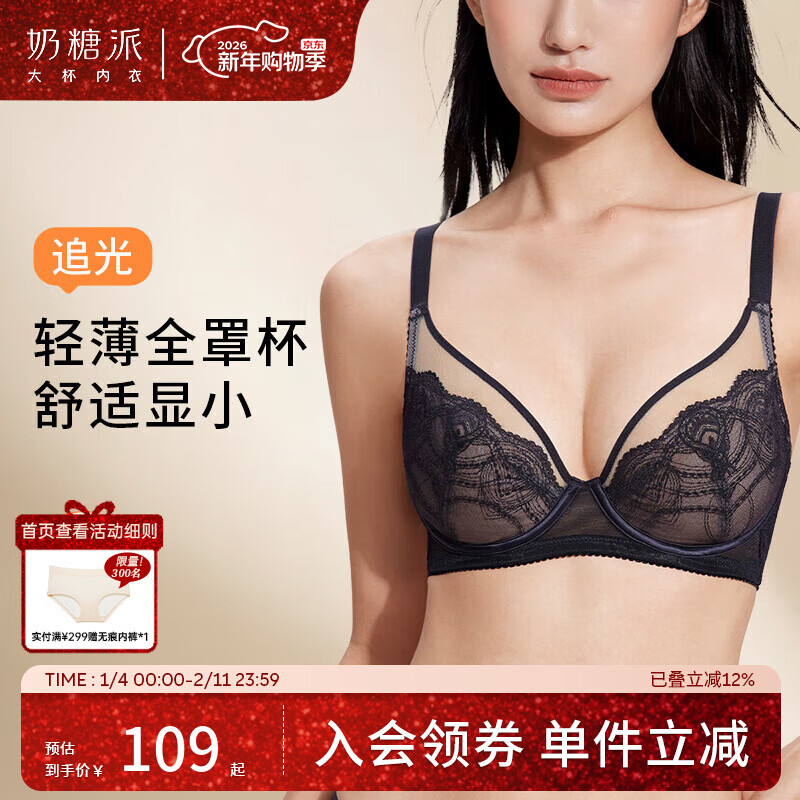 奶糖派追光轻薄全罩杯大胸显小空气感柔软蕾丝透气文胸内衣女送女友 黑色【赠防凸点棉垫】 80C