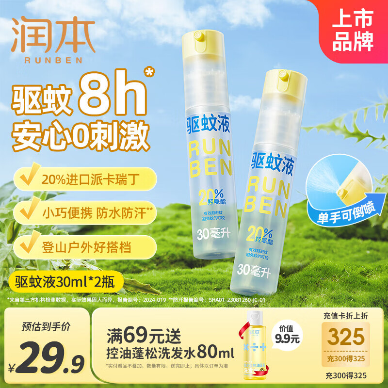 润本(RUNBEN)驱蚊液驱蚊喷雾花露水户外防蚊虫叮咬驱蚊水20%派卡瑞丁30ml*2